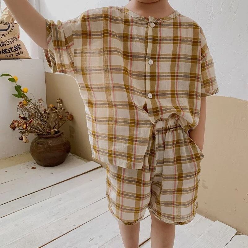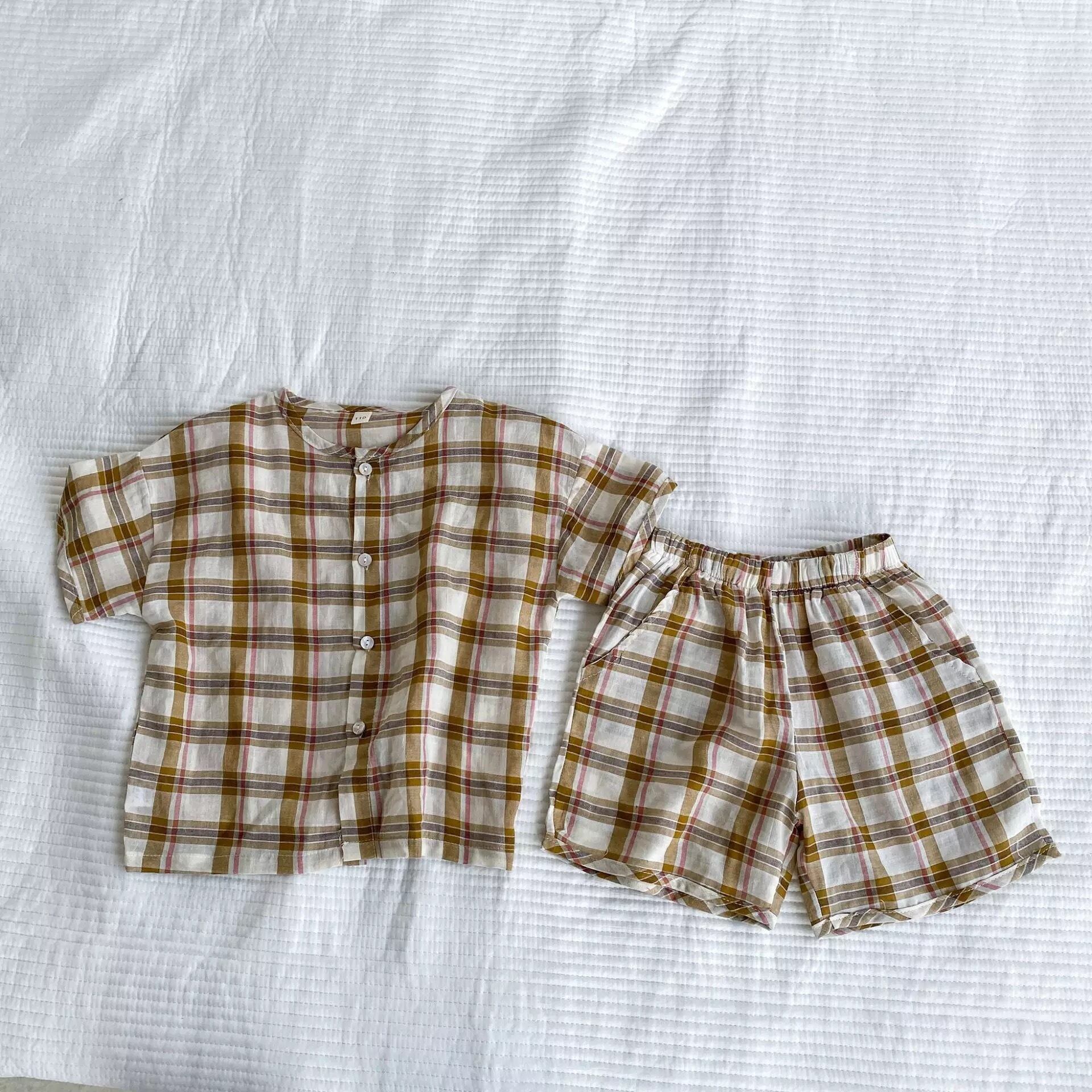 チェック柄ノーカラーシャツ、ショートパンツ❁⃘