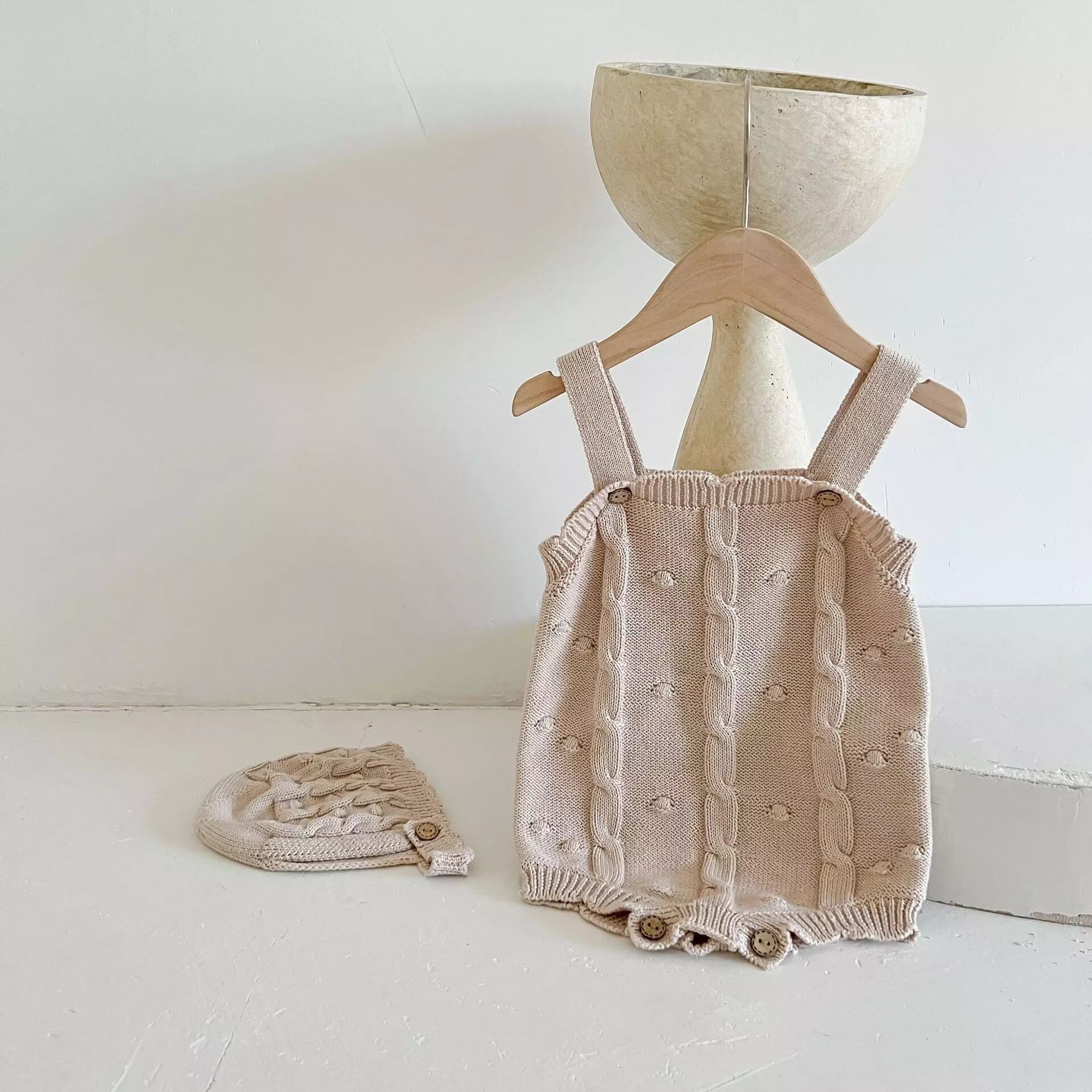 ニットロンパースは肩紐ボタン付き